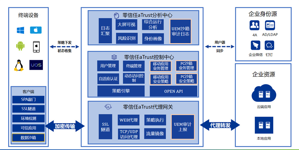 基于零信任安全理念推出的一款以“流量身份化”和“動態自適應訪問控制“為核心的創新安全產品。產品通過網絡隱身、動態自適應認證、終端動態環境檢測、全周期業務準入、智能權限基線、動態訪問控制、多源信任評估等核心能力,滿足新形勢下多場景的企業應用安全訪問需求。同時,aTrust作為零信任平臺ZTA的核心組成部分,支持對接態勢感知、EDR、AC等多種安全設備,安全能力持續成長,助力客戶網絡安全體系向零信任架構遷移,幫助客戶實現流量身份化、權限智能化、訪問控制動態化、運維管理簡化的新一代網絡安全架構。